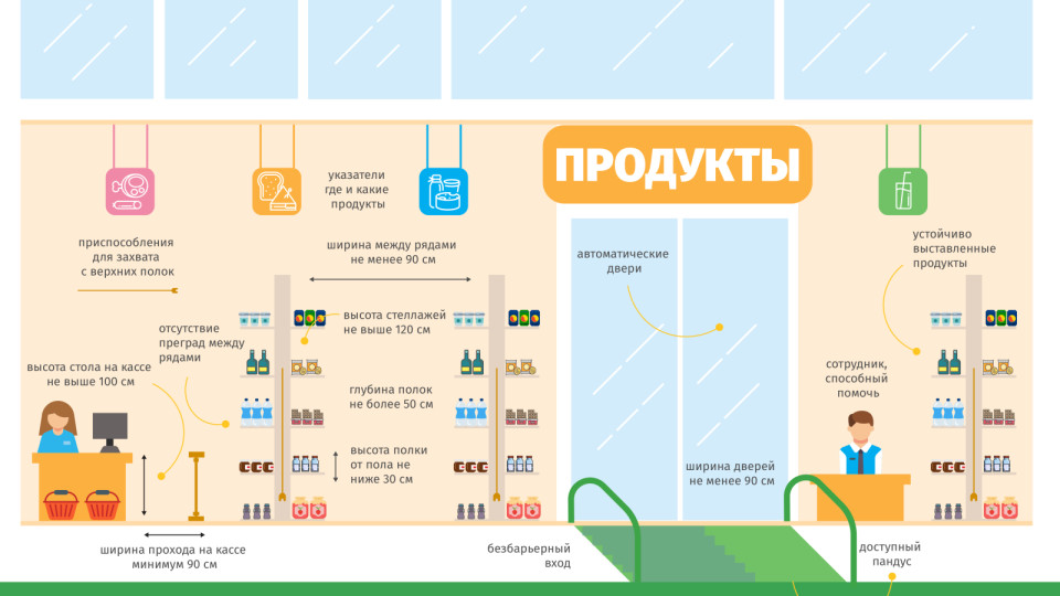 Слишком узкие проходы между стеллажами и неустойчивые продукты на них. Попав в здание, покупатель берет корзину и двигается по рядам, однако если они узкие или заставлены коробками, человеку на коляске пройти между ними уже невозможно. Если в магазине нет навигации, человеку приходится крутиться по всему магазину в поисках необходимых продуктов. По мнению экспертов, необходимо делать ширину проходов минимум 90 см, а таблички с указанием местоположения разлитых категорий продуктов решают проблему с ориентированием.