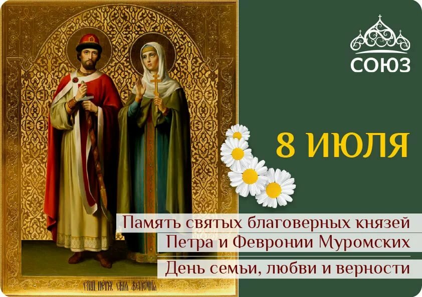 8 июля, начиная с 2008 года, во всех городах России широко отмечают День семьи, любви и верности. Многие считают его достойной альтернативой Дню влюбленных, пришедшему из-за рубежа. Действительно, в отечественном празднике больше духовной любви и преклонения перед верностью и преданностью. А все потому, что праздник тесно связан со святыми Петром и Февронией — парой, являющейся образцом идеальных семейных отношений.